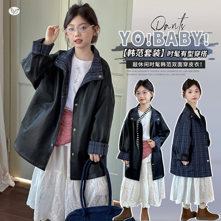首页 > 杭州 > 童装 > 夹克 > 女童秋季新款休闲格子双面穿长款皮衣外套中大童春秋户外挡风夹克 3:4主图